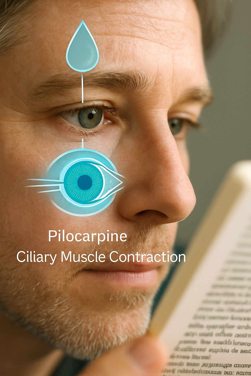 - Μηχανισμός: Μιμητικό της ακετυλοχολίνης → σύσπαση ακτινωτού μυός (ενίσχυση προσαρμογής) & μύση (μείωση σφαιρικών εκτροπών) → πιο «βαθύ» πεδίο εστίασης κοντά.