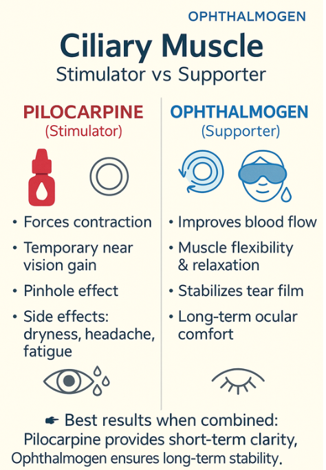 Pilocarpine = ciliary muscle stimulator Ophthalmogen = ciliary muscle supporter