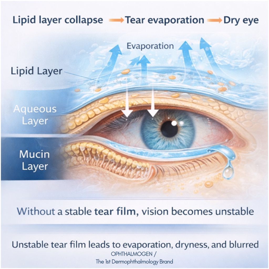 - Ξηροφθαλμία: Το δακρυϊκό φιλμ γίνεται ασταθές, αφήνοντας την οφθαλμική επιφάνεια εκτεθειμένη.