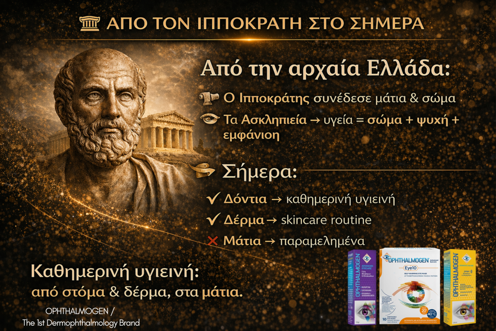 Οι αρχαίοι Έλληνες συνέδεσαν την υγεία με την αρμονία σώματος και πνεύματος. Ο Ιπποκράτης μιλούσε για «ρινικά κακά» που επηρεάζουν τα μάτια, ενώ στα Ασκληπιεία η φροντίδα της υγείας ήταν πάντα συνδεδεμένη με την αισθητική και την ψυχή.