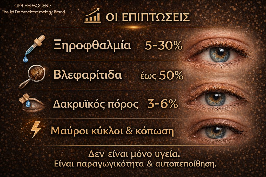- Ξηροφθαλμία: επηρεάζει 5–30% του πληθυσμού, με τεράστια διακύμανση ανάλογα με ηλικία, κλίμα και χρήση οθονών.