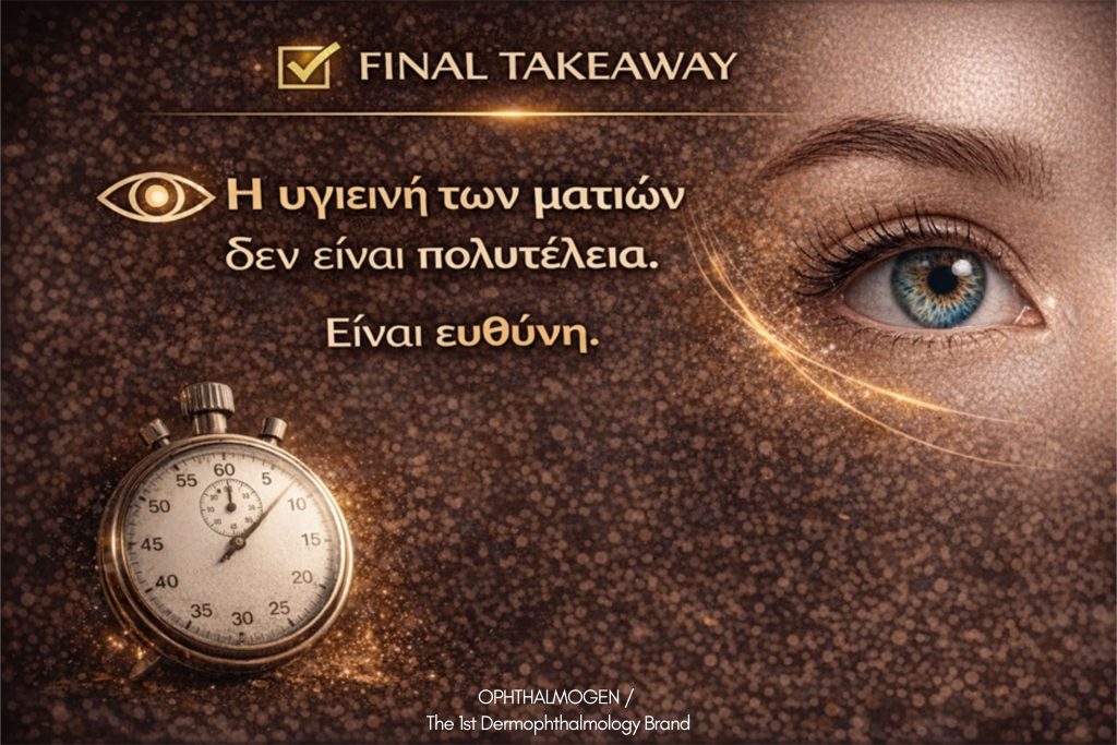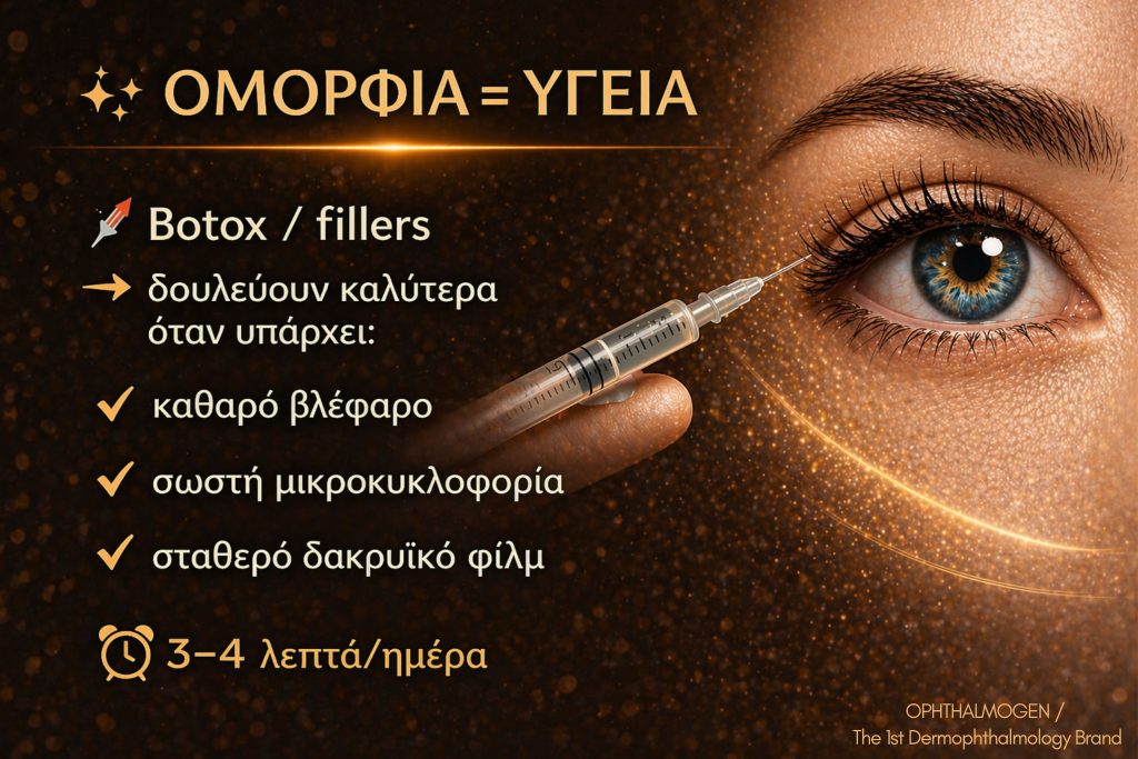 Η οφθαλμική υγιεινή δεν ανταγωνίζεται την αισθητική ιατρική· την ενισχύει. Όπως το βούρτσισμα κάνει τη λεύκανση πιο αποτελεσματική, έτσι και η καθημερινή φροντίδα των ματιών κάνει Botox, fillers και επεμβάσεις πιο φυσικά και ανθεκτικά.