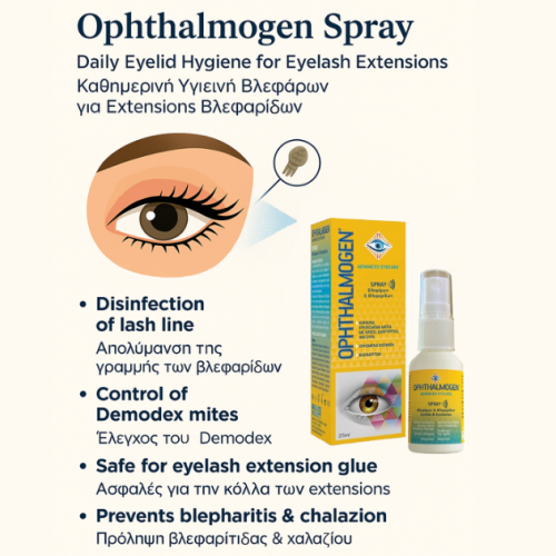- For eyelash extension users: spray daily with Ophthalmogen Spray to disinfect the lash base and prevent Demodex overgrowth.