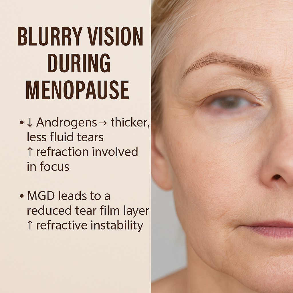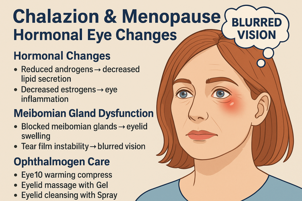 Menopause brings hormonal changes that disrupt the lipid layer of tears, making women more vulnerable to dry eye, blurry vision, blepharitis, and chalazion.