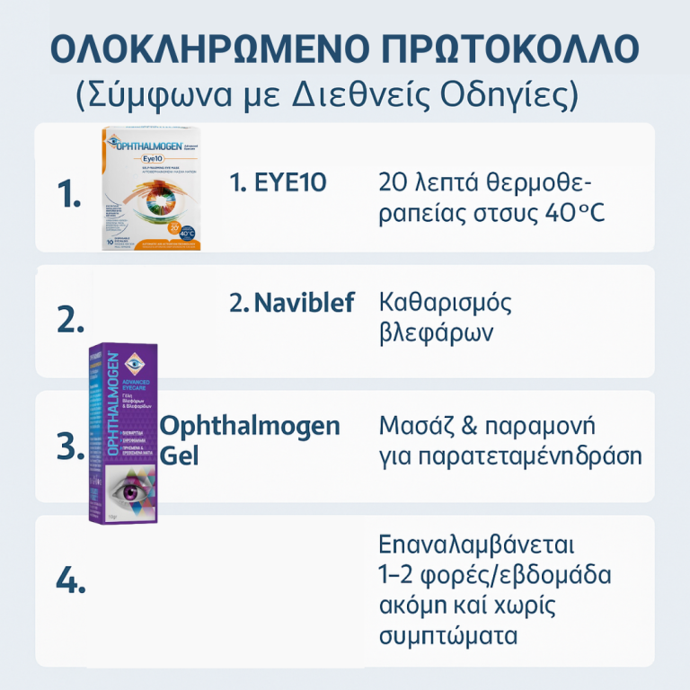 The following protocol with Ophthalmogen EYE10, Naviblef, and Ophthalmogen Gel follows these principles.