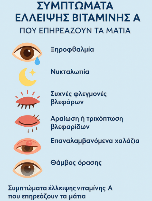 Vitamin A is essential for eye health, the stability of the tear film, and the defense of the eyelids against inflammation.