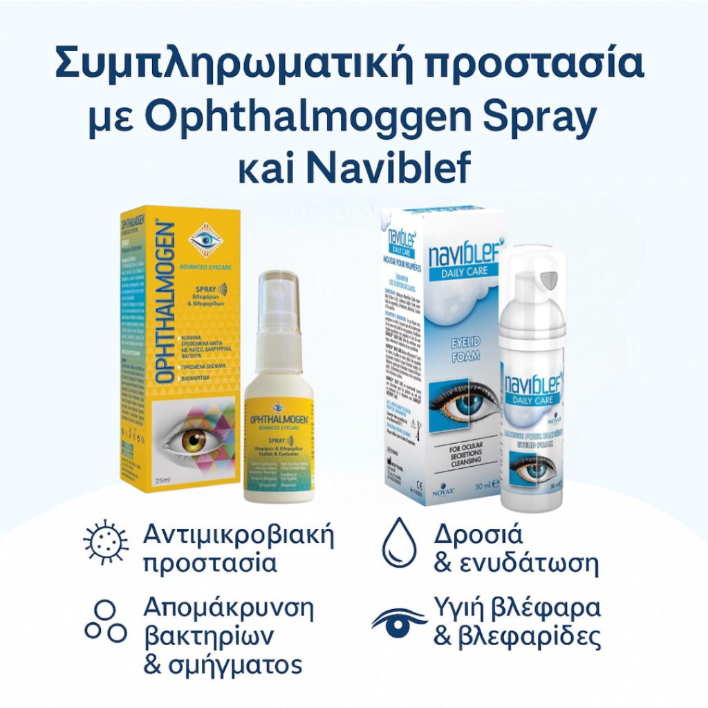- Ophthalmogen Spray: antimicrobial protection and refreshing comfort, 2–3 times/day.