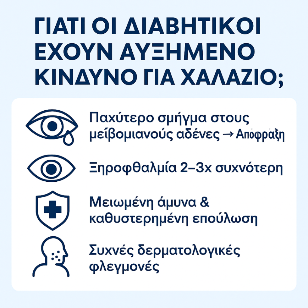 Chalazion is common in diabetic patients, linked to changes in skin, tear film, and reduced immune defense.
