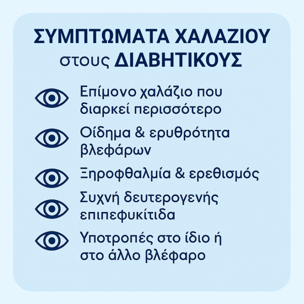 In diabetic patients, minor inflammations and infections last longer. This means a simple chalazion may persist for weeks, recur, or be complicated by conjunctivitis.