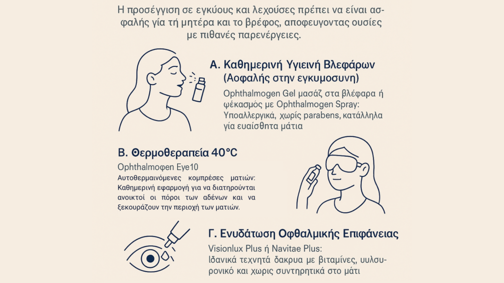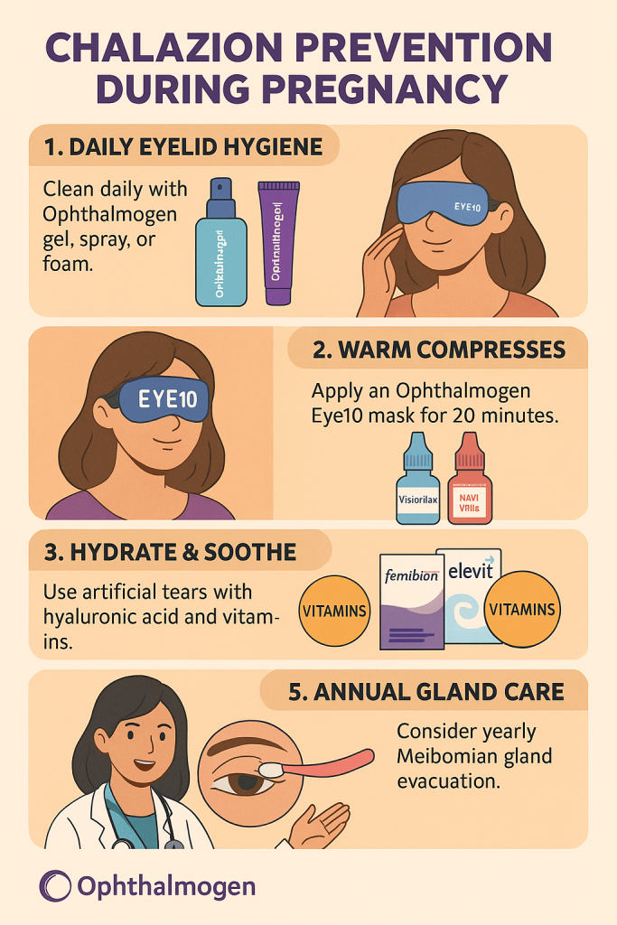 Pregnancy and childbirth increase the risk of chalazion due to hormonal changes, immune suppression, and lifestyle adjustments. With safe daily hygiene using Ophthalmogen Gel, Spray, Eye10 masks, along with supportive hydration and vitamins like Femibion, Elevit, Pregnacare, women can protect their eyes, reduce chalazion recurrence, and maintain bright, healthy vision.
