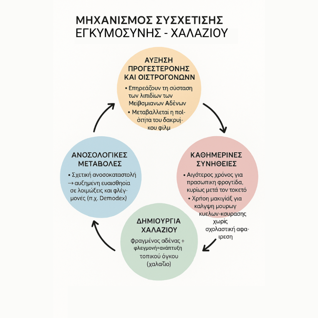 Pregnancy and the postpartum period bring intense hormonal and immune changes that affect the skin, mucous membranes, eyelids, eyelashes, and ocular surface. These shifts, combined with fluid retention and often limited daily eye care, can trigger inflammation and blockage of the Meibomian glands, leading to a higher risk of chalazion.
