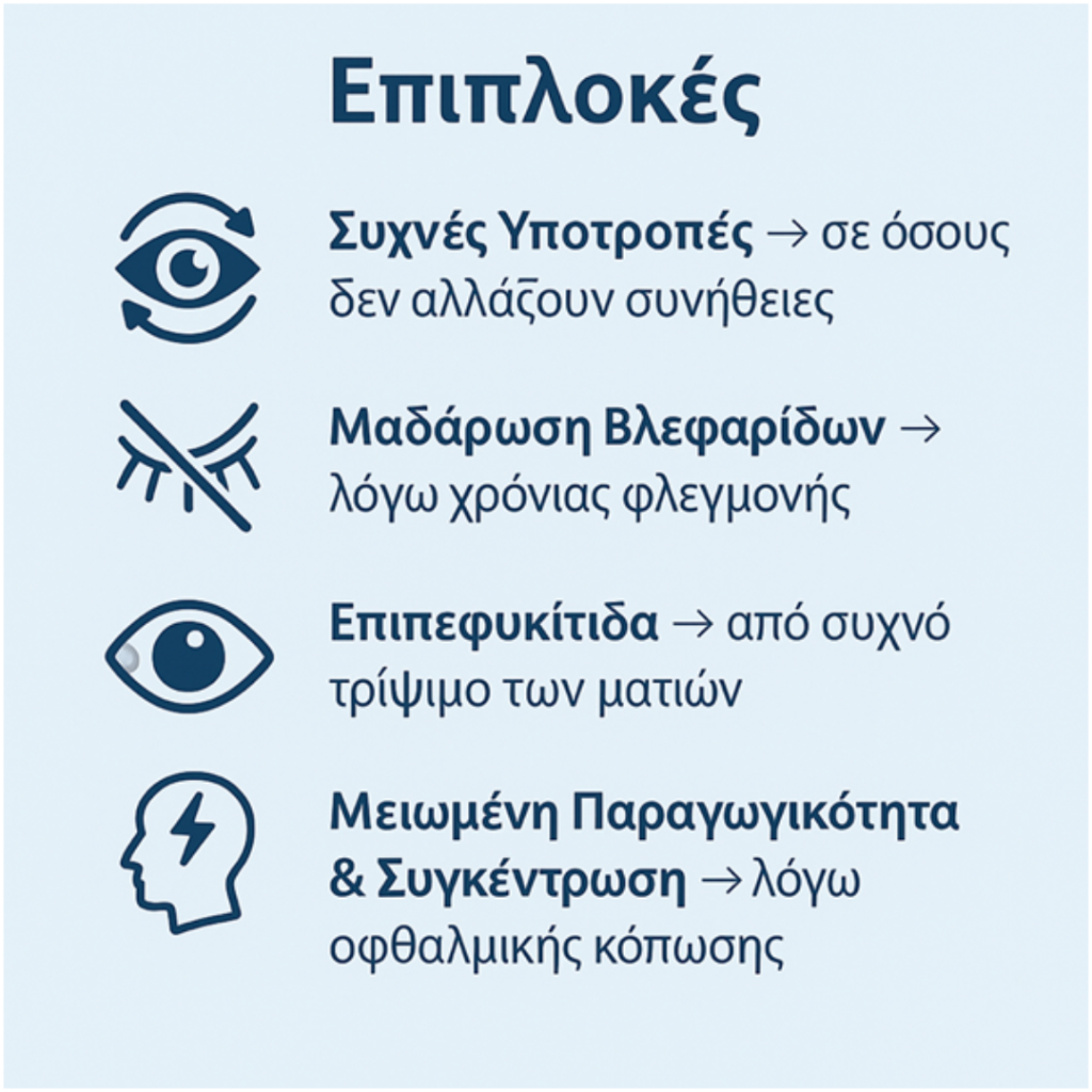 Eye fatigue increases the tendency to rub the eyes → entry of bacteria → worsening blepharitis and chalazion.