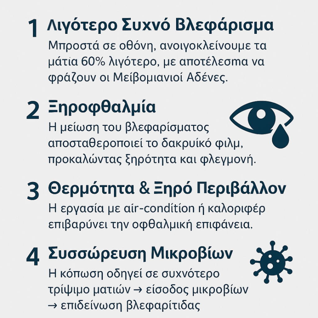 When using screens, we blink 60% less often. This means meibomian glands do not drain properly → oil builds up → blockage → chalazion.