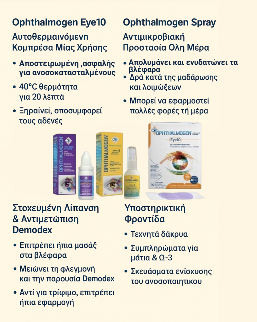 Dermophthalmology offers a comprehensive solution with the Ophthalmogen line (Eye10, Gel, Spray, Naviblef), combined with artificial tears, Omega-3, and vitamins.