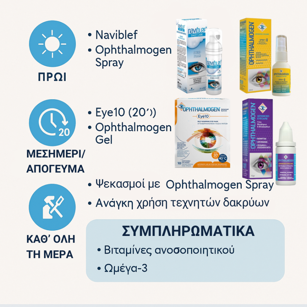 - Noon/Afternoon: Eye10 (20’) → OphthalmogenGel with gentle massage.