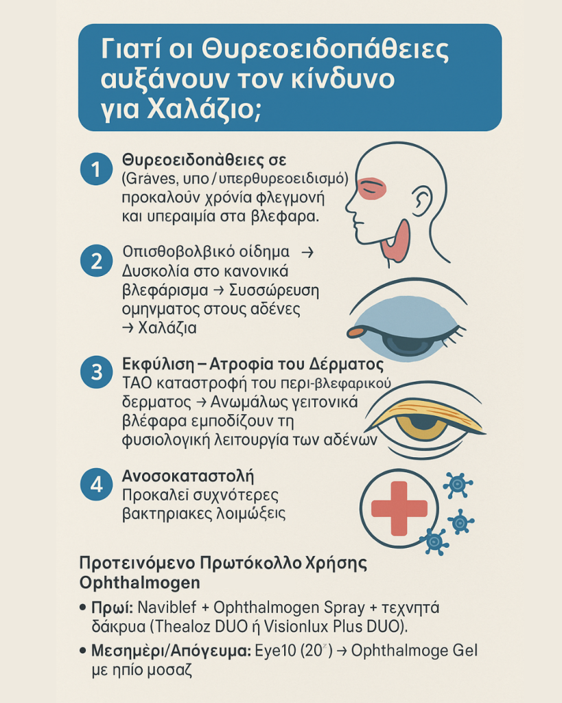 Thyroid disorders, especially Graves’ Ophthalmopathy and Hashimoto’s thyroiditis, significantly increase the risk of chalazion due to dry eye, MGD, inflammation, and immune mechanisms.