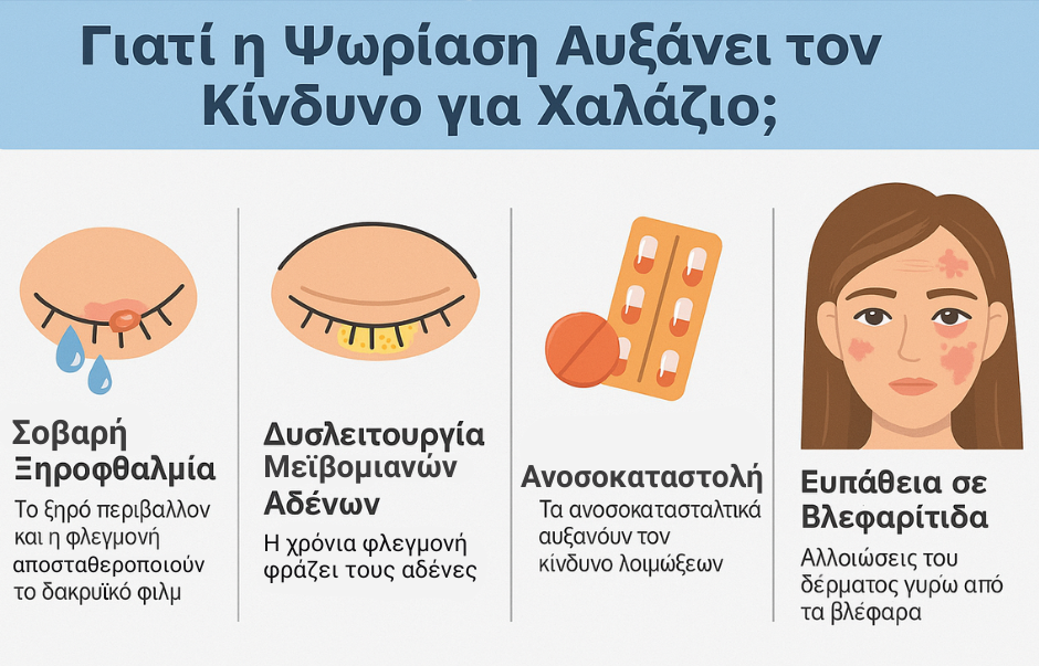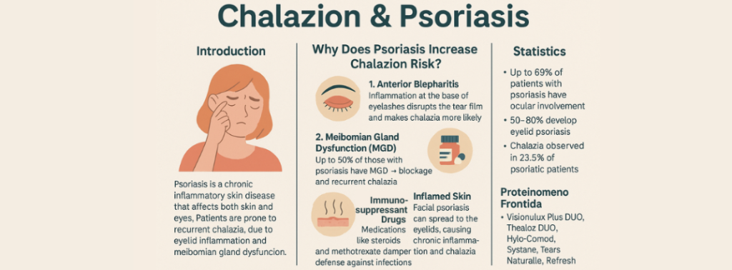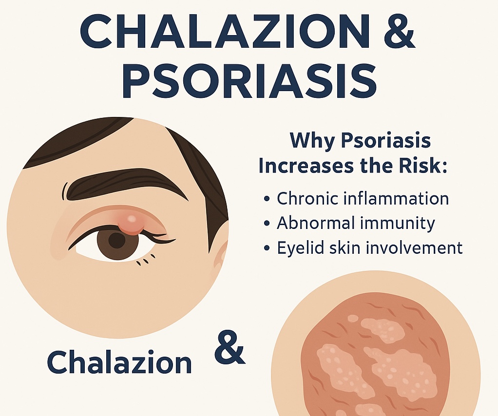 Both conditions create an environment that favors chalazion: dry eye, inflammation, microbial overgrowth, and gland obstruction.
