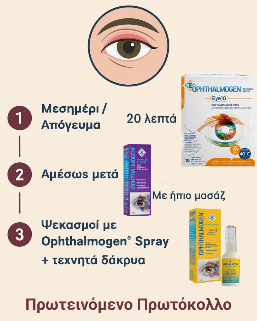 - Noon/Afternoon: Eye10 (20’) → Ophthalmogen Gel with gentle massage.