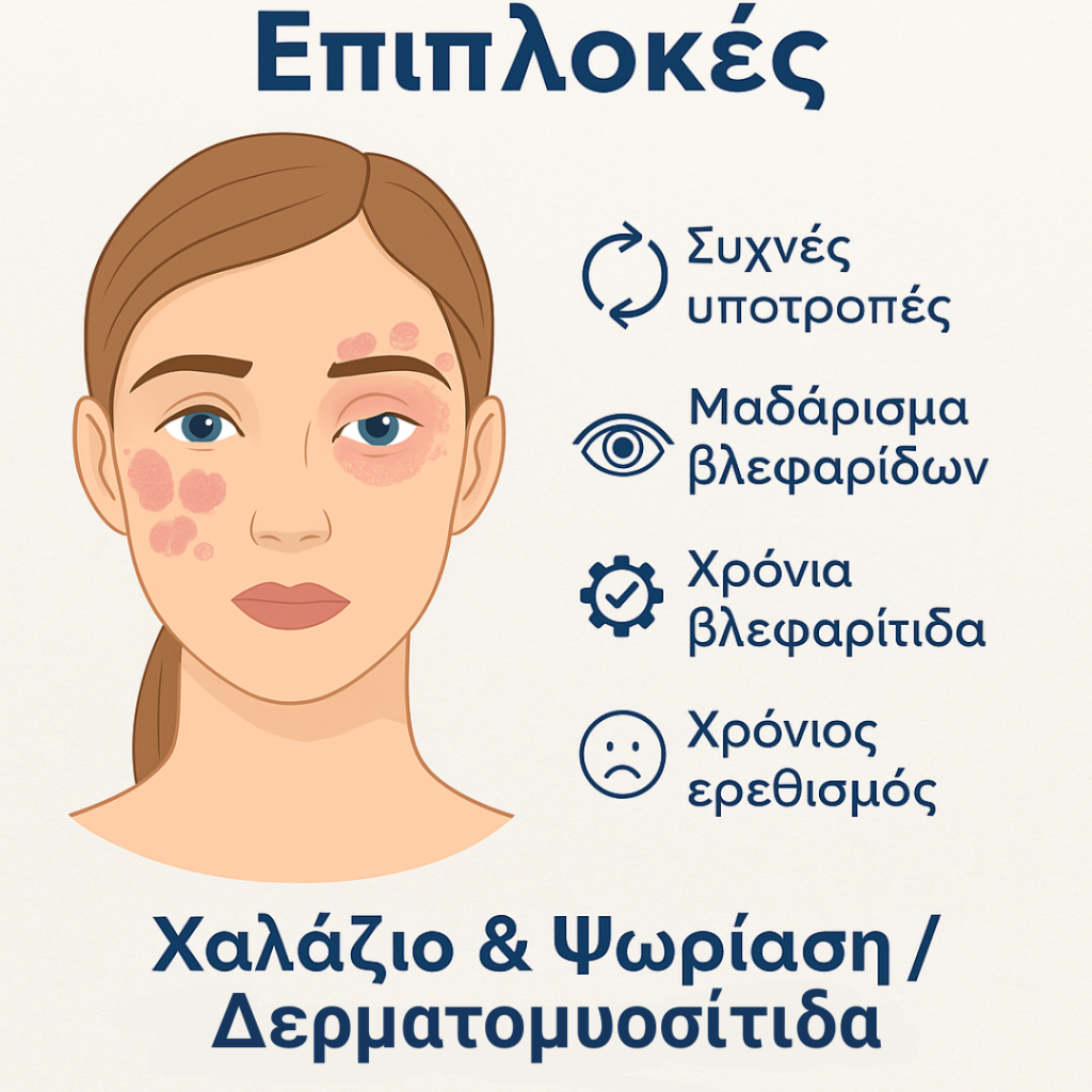 Chalazion in patients with psoriasis and dermatomyositis is more frequent, more inflammatory, and more resistant due to the nature of these diseases and immunosuppressive treatment.