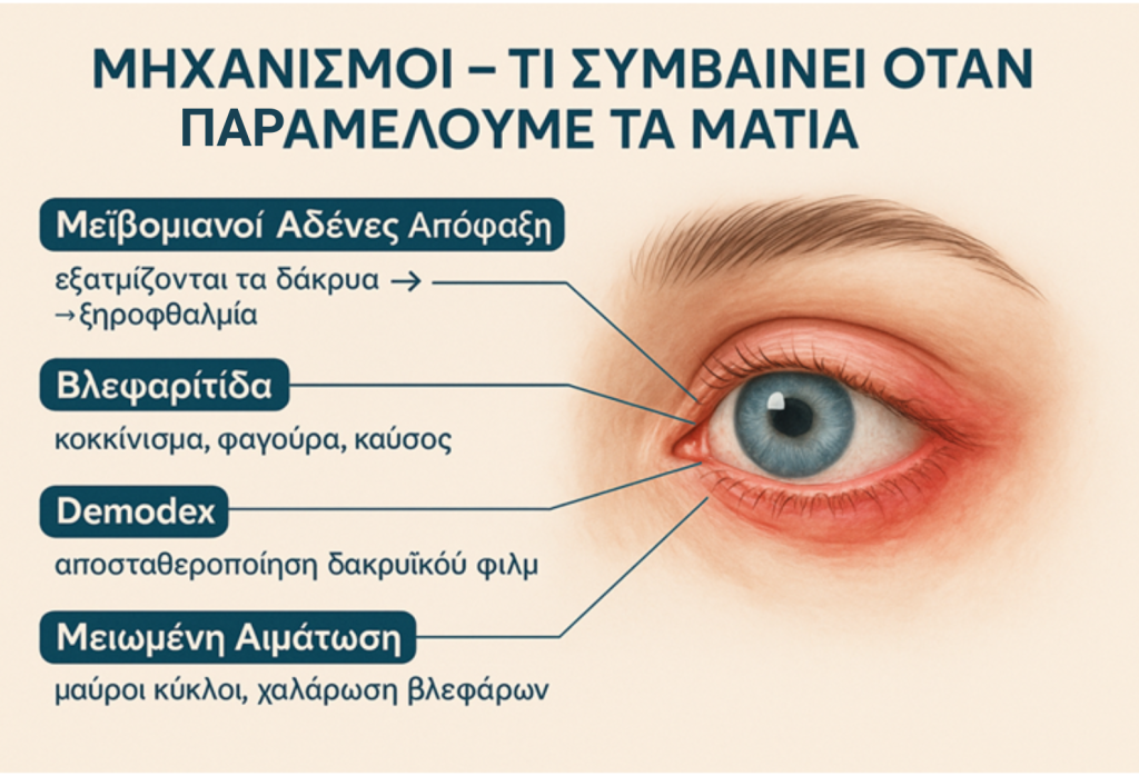 - Blocked meibomian glands → tears evaporate faster → dry eyes.