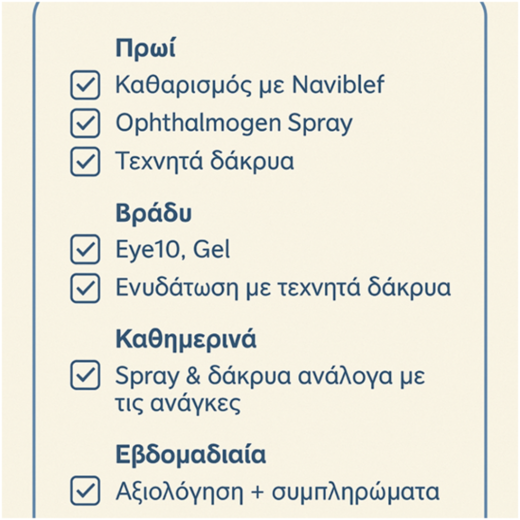 - Morning: Naviblef cleansing with lukewarm water, Ophthalmogen Spray, artificial tears.