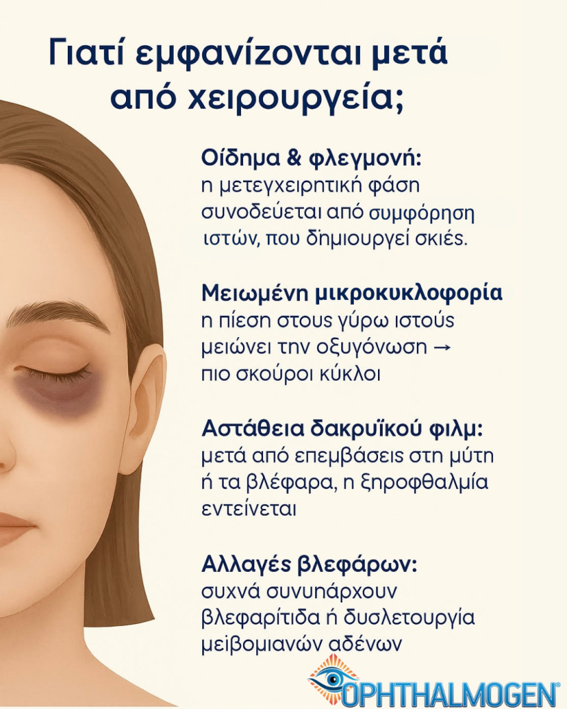 Post-operative dry eye burdens the ocular surface, making dark circles more pronounced.