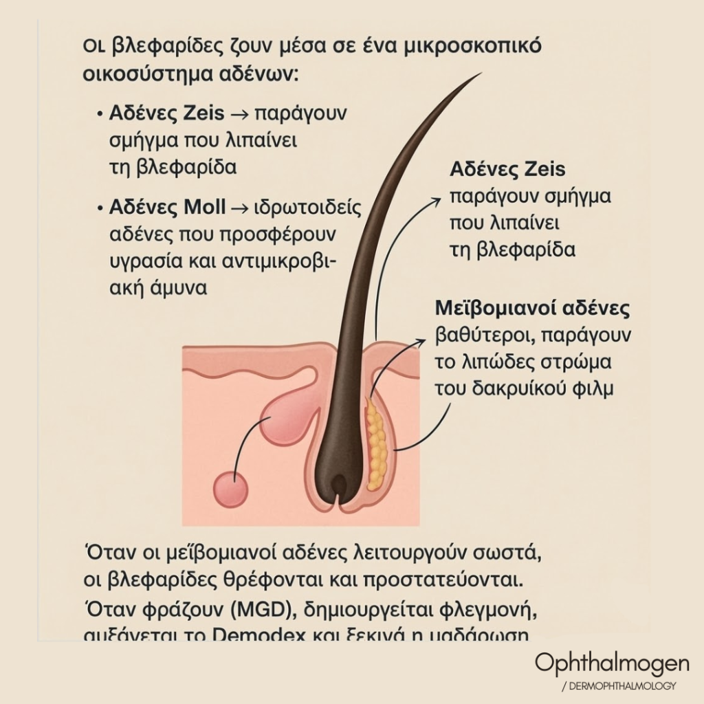 Each lash is supported by microscopic glands that keep the lid margin balanced: