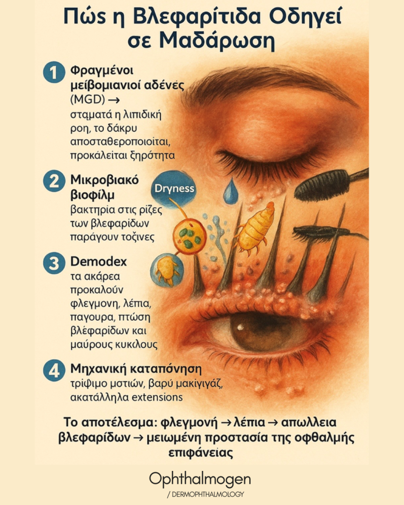 Meibomian gland blockage (MGD) → the lipid flow stops, the tear film destabilizes, inflammation begins.