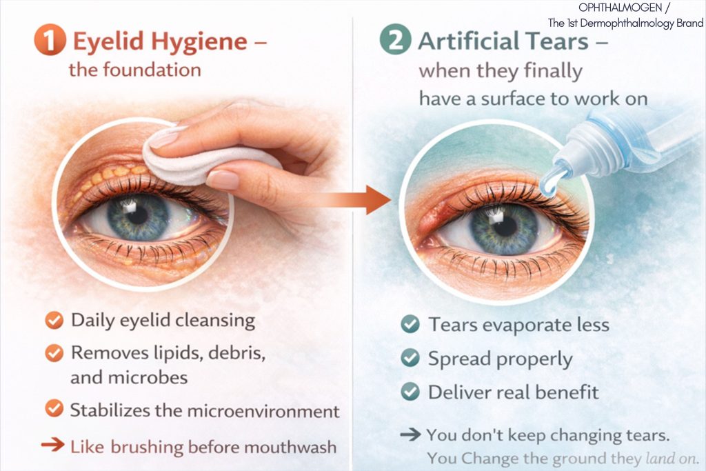 in the same way:no eye drops can save eyes without eyelid hygiene.This is not a communication trick.It is biological reality.