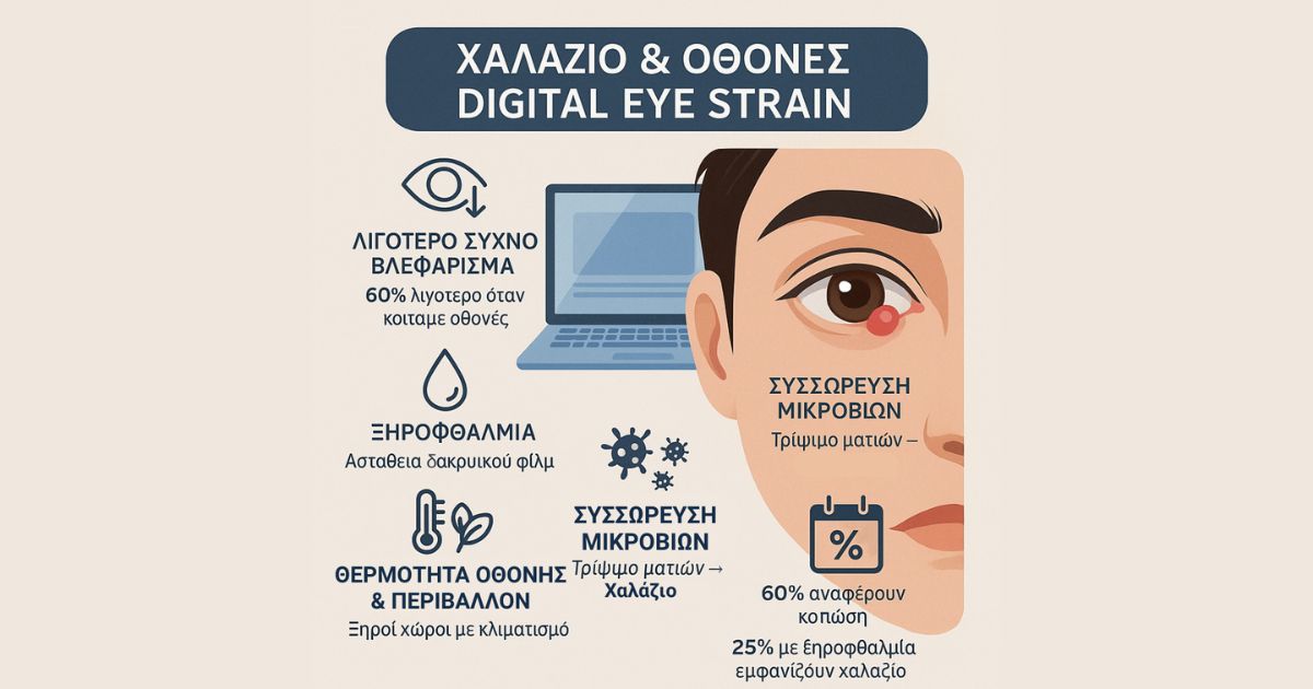 Εισαγωγή Στη σύγχρονη εποχή οι περισσότεροι περνούν ώρες μπροστά σε οθόνες – υπολογιστή, κινητού, tablet. Η υπερβολική χρήση οθονών προκαλεί το λεγόμενο Digital Eye Strain (ψηφιακή κόπωση των ματιών). Η παρατεταμένη εργασία μπροστά σε οθόνες δεν προκαλεί μόνο ξηροφθαλμία και πονοκεφάλους, αλλά και αυξάνει τον κίνδυνο για χαλάζιο. Οι χρήστες οθονών, ιδιαίτερα όσοι δεν ακολουθούν […]