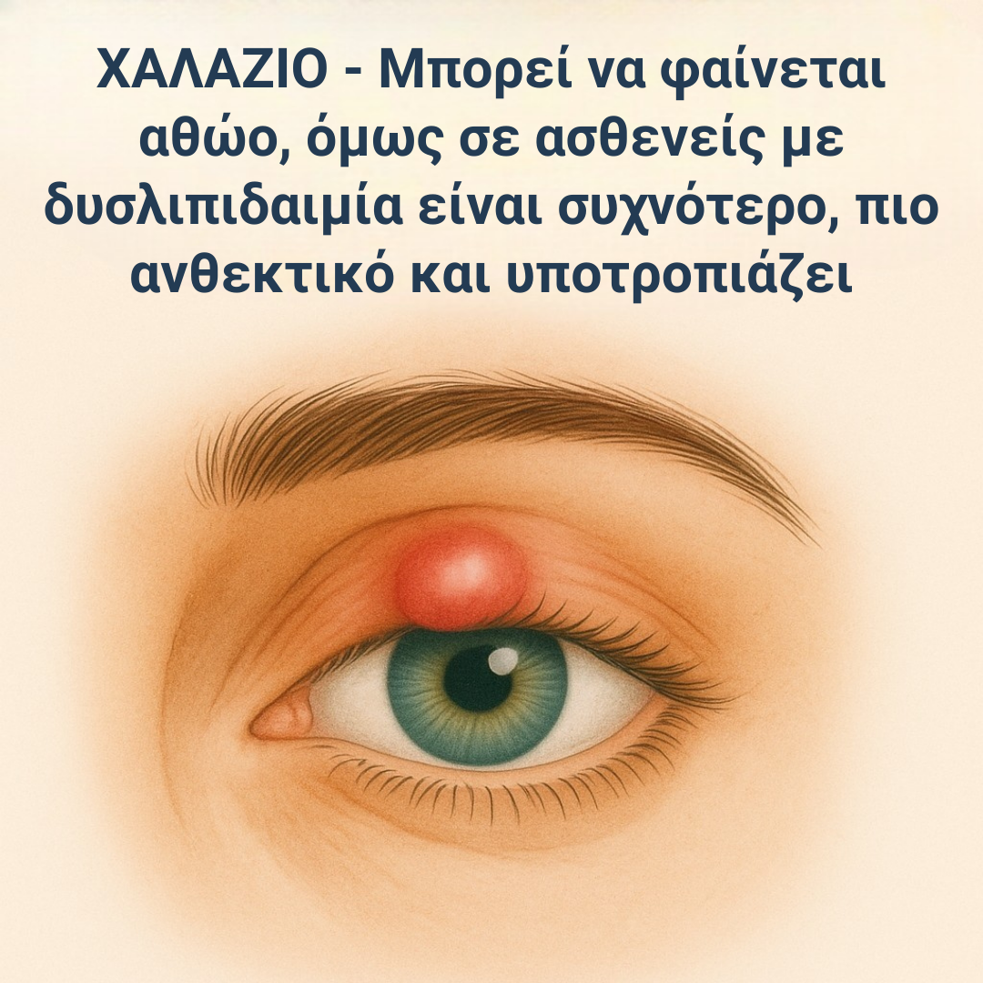 Εισαγωγή Η δυσλιπιδαιμία – δηλαδή η διαταραχή των λιπιδίων στο αίμα (υψηλή χοληστερίνη, αυξημένα τριγλυκερίδια, χαμηλή HDL) – δεν επηρεάζει μόνο την καρδιά και τα αγγεία. Επηρεάζει και το δέρμα, τους Μεϊβομιανούς Αδένες και την οφθαλμική υγεία. Ένα από τα προβλήματα που συχνά εμφανίζονται σε αυτούς τους ασθενείς είναι το χαλάζιο. Το χαλάζιο, μια χρόνια […]